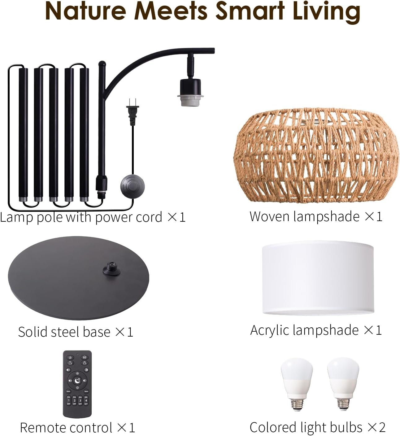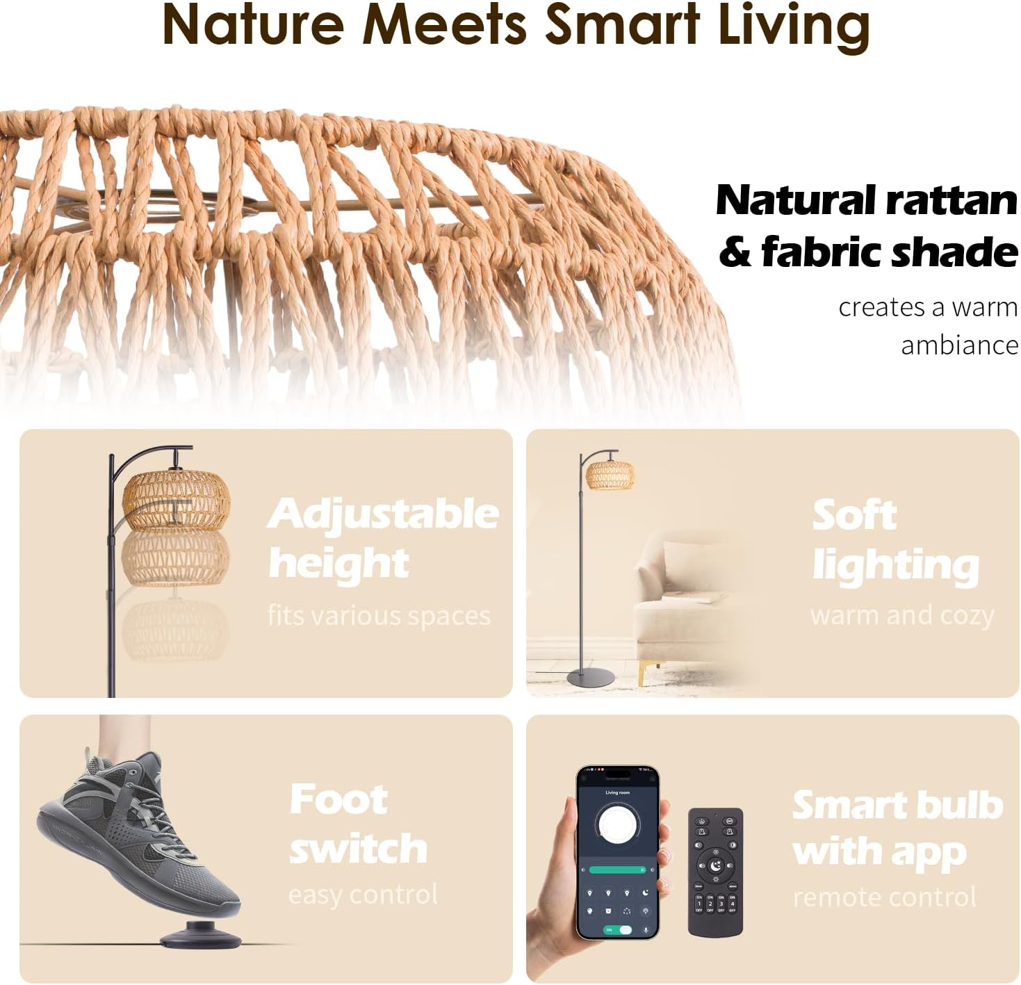 Boho Rattan Floor Lamp with Shade – 12W Bright LED Bulb, Adjustable Height 48-60 Inch, Remote Control 3 Color Temperatures, Handwoven Arc Standing Light for Living Room